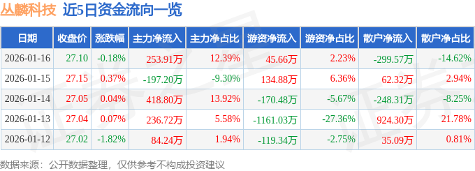 证券之星消息,截至2026年1月16日收盘,丛麟科技(688370)报收于27.1元,下跌0.18%,换手率1.73%,成交量7588.0手,成交额2049.41万元。