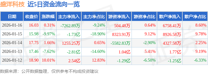 证券之星消息,截至2026年1月16日收盘,盛洋科技(603703)报收于16.03元,上涨0.31%,换手率11.91%,成交量49.43万手,成交额7.86亿元。