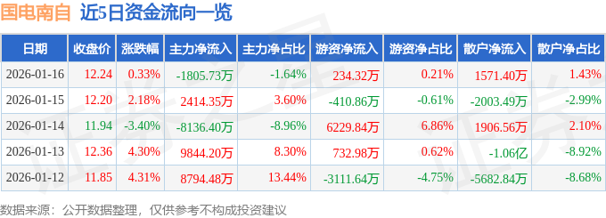 证券之星消息,截至2026年1月16日收盘,国电南自(600268)报收于12.24元,上涨0.33%,换手率8.52%,成交量86.16万手,成交额10.99亿元。