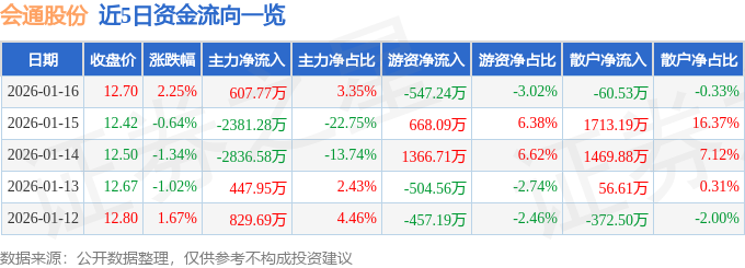 证券之星消息,截至2026年1月16日收盘,会通股份(688219)报收于12.7元,上涨2.25%,换手率2.61%,成交量14.35万手,成交额1.81亿元。