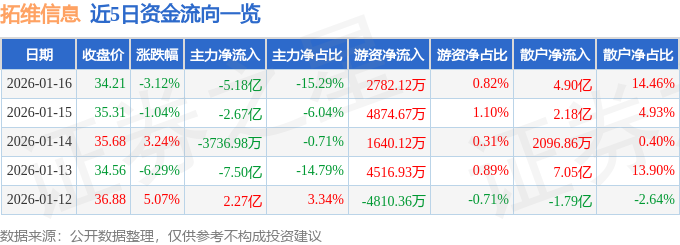 证券之星消息,截至2026年1月16日收盘,拓维信息(002261)报收于34.21元,下跌3.12%,换手率8.58%,成交量98.27万手,成交额33.89亿元。