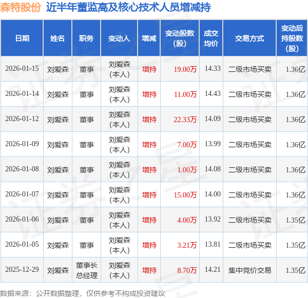 森特股份近半年内的董监高及核心技术人员增减持详情如下:
