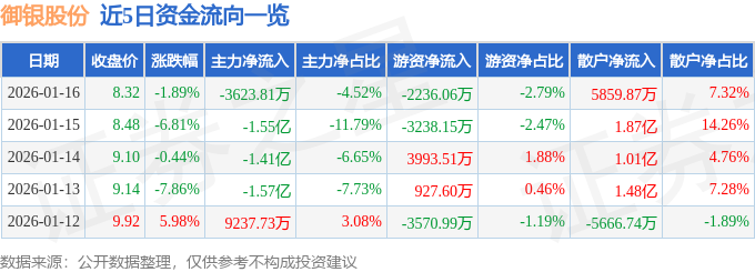 证券之星消息,截至2026年1月16日收盘,御银股份(002177)报收于8.32元,下跌1.89%,换手率14.26%,成交量96.25万手,成交额8.01亿元。