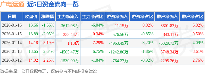 1月16日的资金流向数据方面,主力资金净流出3612.98万元,占总成交额6.04%,游资资金净流入11.15万元,占总成交额0.02%,散户资金净流入3601.83万元,占总成交额6.02%。