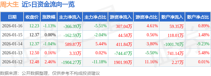 证券之星消息,截至2026年1月16日收盘,周大生(002867)报收于12.23元,下跌1.13%,换手率0.5%,成交量5.41万手,成交额6653.91万元。