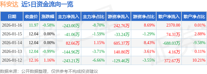 证券之星消息,截至2026年1月16日收盘,科安达(002972)报收于11.97元,下跌0.58%,换手率1.73%,成交量2.33万手,成交额2793.38万元。