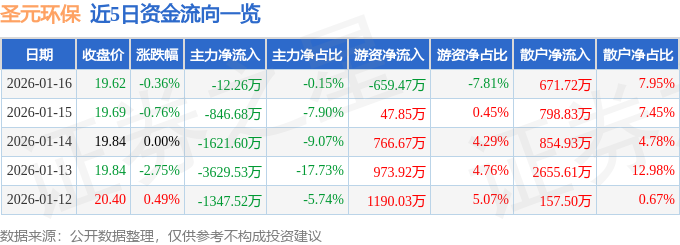 证券之星消息,截至2026年1月16日收盘,圣元环保(300867)报收于19.62元,下跌0.36%,换手率2.24%,成交量4.29万手,成交额8449.0万元。