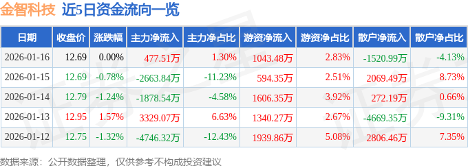 证券之星消息,截至2026年1月16日收盘,金智科技(002090)报收于12.69元,上涨0.0%,换手率7.2%,成交量28.53万手,成交额3.69亿元。