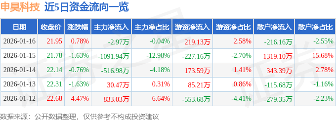 证券之星消息,截至2026年1月16日收盘,申昊科技(300853)报收于21.95元,上涨0.78%,换手率3.5%,成交量3.85万手,成交额8480.56万元。