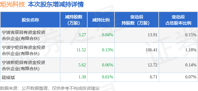 证券之星消息,1月16日炬光科技发布公告《炬光科技:西安炬光科技股份有限公司简式权益变动报告书》,其股东宁波吉辰自有资金投资合伙企业(有限合伙)、宁波宁炬自有资金投资合伙企业(有限合伙)、宁波新炬自有资金投资合伙企业(有限合伙)、延绥斌于2026年1月14日至2026年1月16日间合计减持21.71万股,占公司目前总股本的0.2416%,变动期间该股股价上涨5.72%,截止1月16日收盘报187.15元。