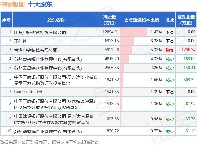 根据中际旭创2025年三季报公布的十大股东详情如下: