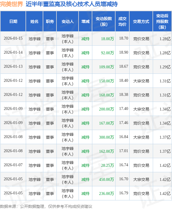 完美世界近半年内的董监高及核心技术人员增减持详情如下: