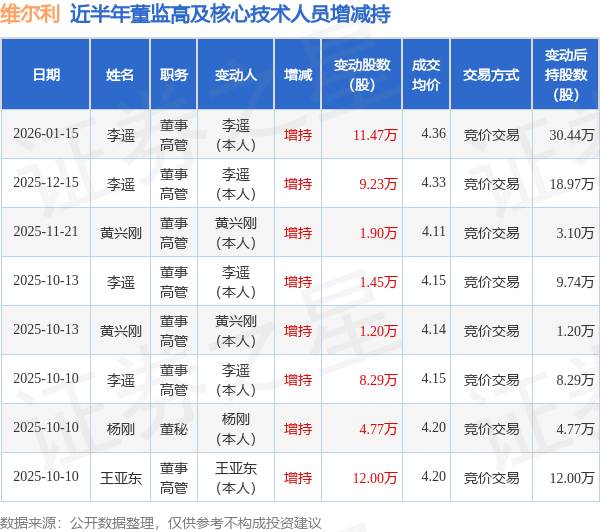 维尔利近半年内的董监高及核心技术人员增减持详情如下: