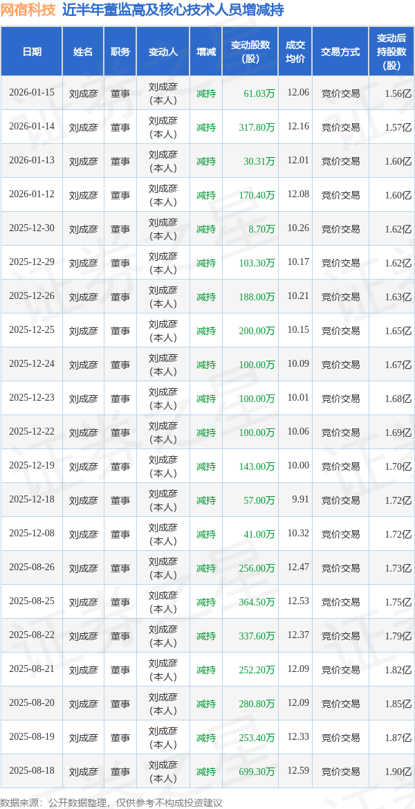 证券之星消息,根据1月16日市场公开信息、上市公司公告及交易所披露数据整理,网宿科技(300017)最新董监高及相关人员股份变动情况:2026年1月15日公司董事刘成彦共减持公司股份61.03万股,占公司总股本为0.0248%。变动期间公司股价下跌1.32%,1月15日当日收盘报11.92元。