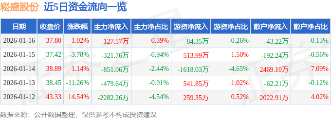 证券之星消息,截至2026年1月16日收盘,崧盛股份(301002)报收于37.8元,上涨1.02%,换手率11.56%,成交量8.68万手,成交额3.23亿元。