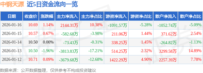 证券之星消息,截至2026年1月16日收盘,中钢天源(002057)报收于10.69元,上涨1.14%,换手率2.57%,成交量19.38万手,成交额2.07亿元。