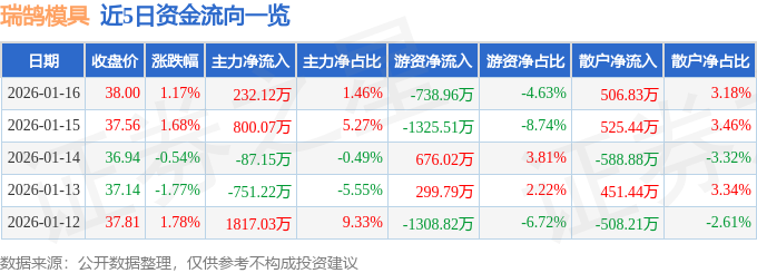 证券之星消息,截至2026年1月16日收盘,瑞鹄模具(002997)报收于38.0元,上涨1.17%,换手率2.01%,成交量4.21万手,成交额1.6亿元。