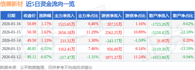 证券之星消息,截至2026年1月16日收盘,信德新材(301349)报收于50.89元,上涨1.17%,换手率7.25%,成交量3.55万手,成交额1.79亿元。