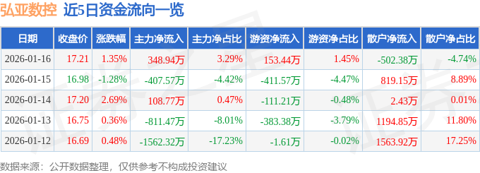 证券之星消息,截至2026年1月16日收盘,弘亚数控(002833)报收于17.21元,上涨1.35%,换手率2.14%,成交量6.17万手,成交额1.06亿元。