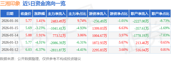 证券之星消息,截至2026年1月16日收盘,三湘印象(000863)报收于5.77元,上涨1.41%,换手率3.87%,成交量44.99万手,成交额2.55亿元。