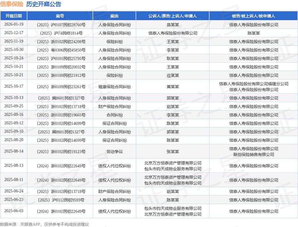 案号:(2025)沪0107民初28760号根据统计,近一年内以信泰人寿保险股份有限公司为当事人的历史开庭公告有27则,其中案由为“人身保险合同纠纷”的公告以11则居首,其次为“债权人代位权纠纷”有4则,“保证合同纠纷”有2则。历史开庭公告(前20条)如下: