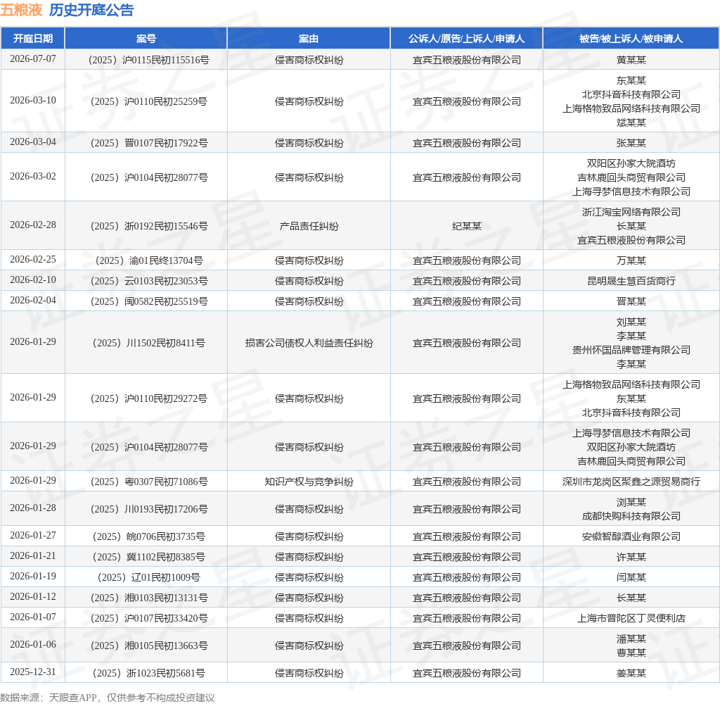 案号:(2025)辽01民初1009号根据统计,近一年内以宜宾五粮液股份有限公司为当事人的历史开庭公告有296则,其中案由为“侵害商标权纠纷”的公告以255则居首,其次为“商标权权属、侵权纠纷”有16则,“侵害商标权”有6则。历史开庭公告(前20条)如下: