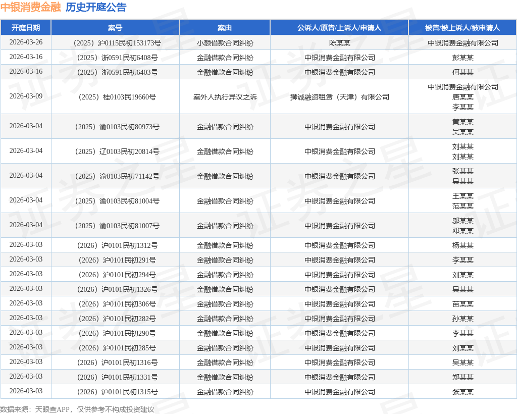 案号:(2025)浙0603民初19020号根据统计,近一年内以中银消费金融有限公司为当事人的历史开庭公告有7330则,其中案由为“金融借款合同纠纷”的公告以5827则居首,其次为“借款合同纠纷”有991则,“小额借款合同纠纷”有448则。历史开庭公告(前20条)如下: