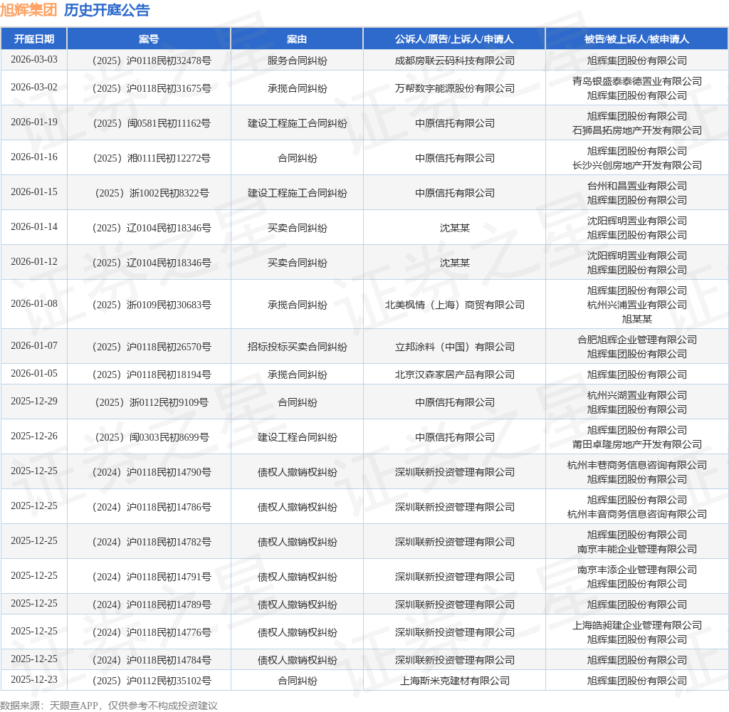案号:(2025)闽0581民初11162号根据统计,近一年内以旭辉集团股份有限公司为当事人的历史开庭公告有100则,其中案由为“债权人撤销权纠纷”的公告以19则居首,其次为“承揽合同纠纷”有12则,“金融借款合同纠纷”有9则。历史开庭公告(前20条)如下: