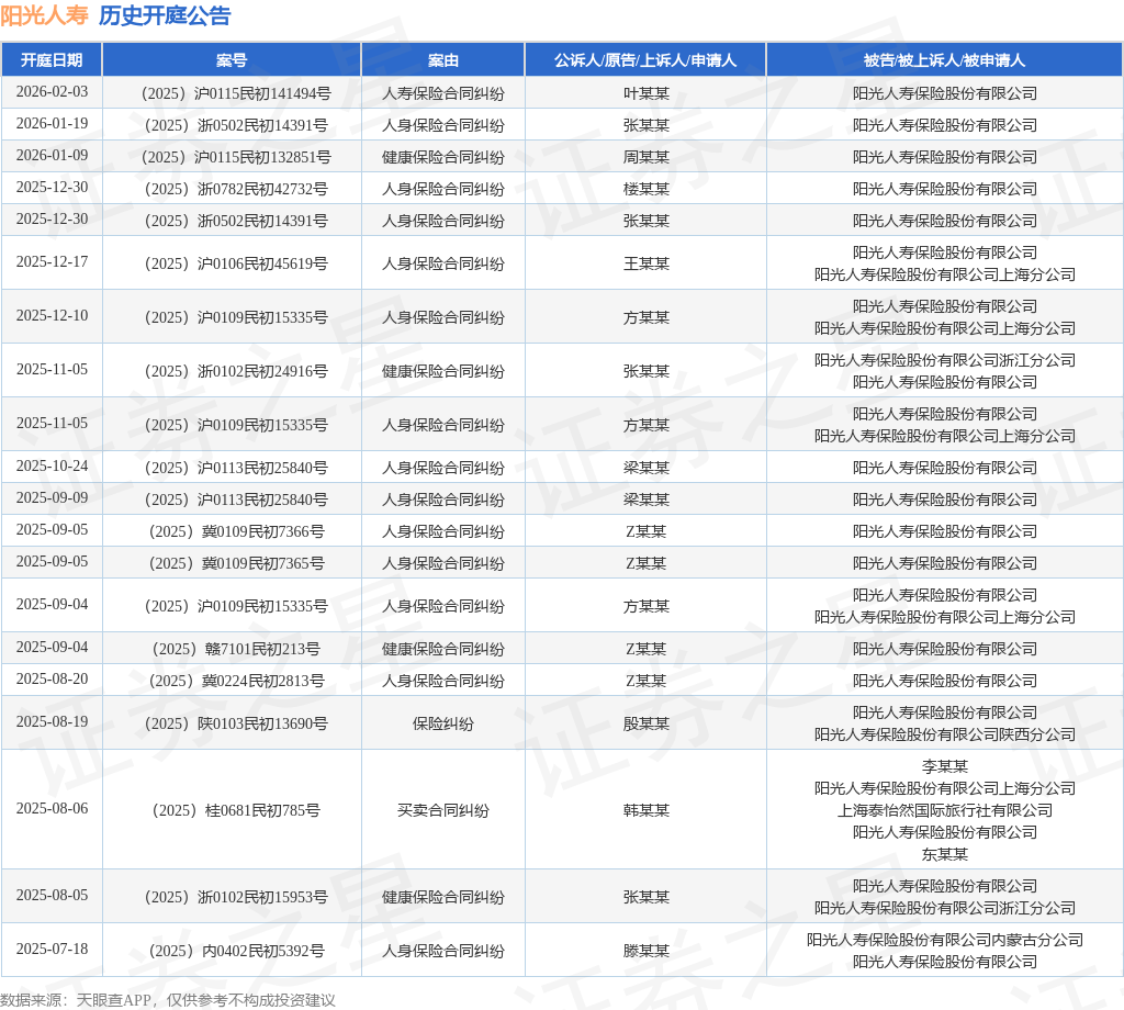 案号:(2025)浙0502民初14391号根据统计,近一年内以阳光人寿保险股份有限公司为当事人的历史开庭公告有39则,其中案由为“人身保险合同纠纷”的公告以20则居首,其次为“保险纠纷”有9则,“健康保险合同纠纷”有5则。历史开庭公告(前20条)如下: