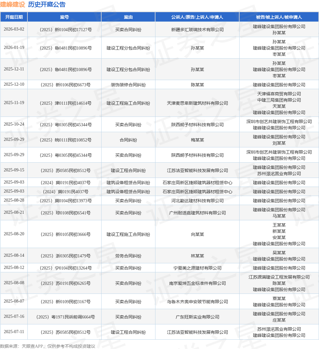 案号:(2025)鲁0481民初10896号根据统计,近一年内以建峰建设集团股份有限公司为当事人的历史开庭公告有65则,其中案由为“买卖合同纠纷”的公告以17则居首,其次为“劳务合同纠纷”有15则,“建筑设备租赁合同纠纷”有8则。历史开庭公告(前20条)如下: