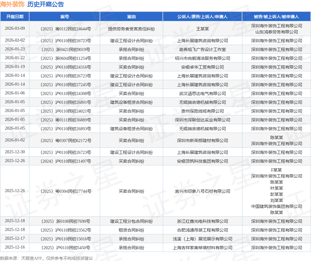 案号:(2025)沪0110民初24316号根据统计,近一年内以深圳海外装饰工程有限公司为当事人的历史开庭公告有106则,其中案由为“买卖合同纠纷”的公告以47则居首,其次为“承揽合同纠纷”有23则,“建设工程分包合同纠纷”有11则。历史开庭公告(前20条)如下: