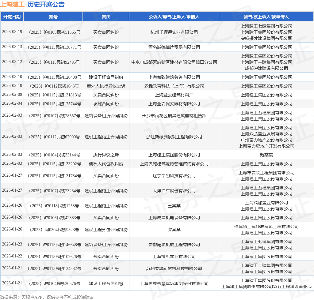 案号:(2025)沪0106民初36315号根据统计,近一年内以上海建工集团股份有限公司为当事人的历史开庭公告有468则,其中案由为“买卖合同纠纷”的公告以129则居首,其次为“建设工程施工合同纠纷”有83则,“案外人执行异议之诉”有50则。历史开庭公告(前20条)如下: