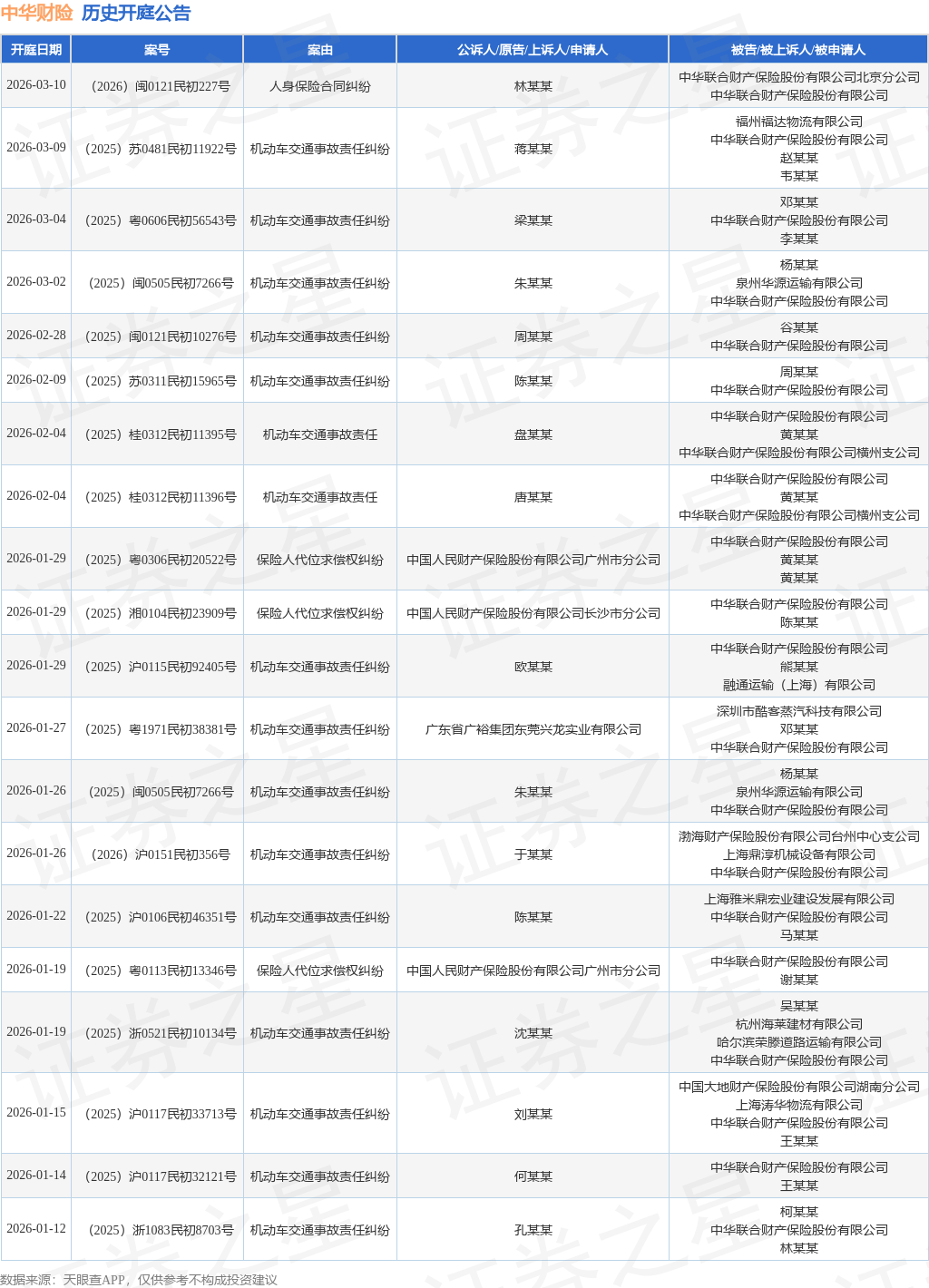 案号:(2025)粤0113民初13346号根据统计,近一年内以中华联合财产保险股份有限公司为当事人的历史开庭公告有590则,其中案由为“机动车交通事故责任纠纷”的公告以333则居首,其次为“财产保险合同纠纷”有46则,“保险人代位求偿权纠纷”有42则。历史开庭公告(前20条)如下: