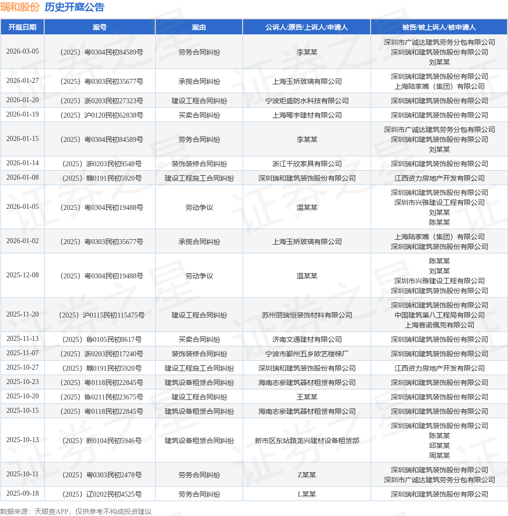 案号:(2025)沪0120民初62838号根据统计,近一年内以深圳瑞和建筑装饰股份有限公司为当事人的历史开庭公告有102则,其中案由为“买卖合同纠纷”的公告以22则居首,其次为“劳务合同纠纷”有21则,“建设工程施工合同纠纷”有12则。历史开庭公告(前20条)如下: