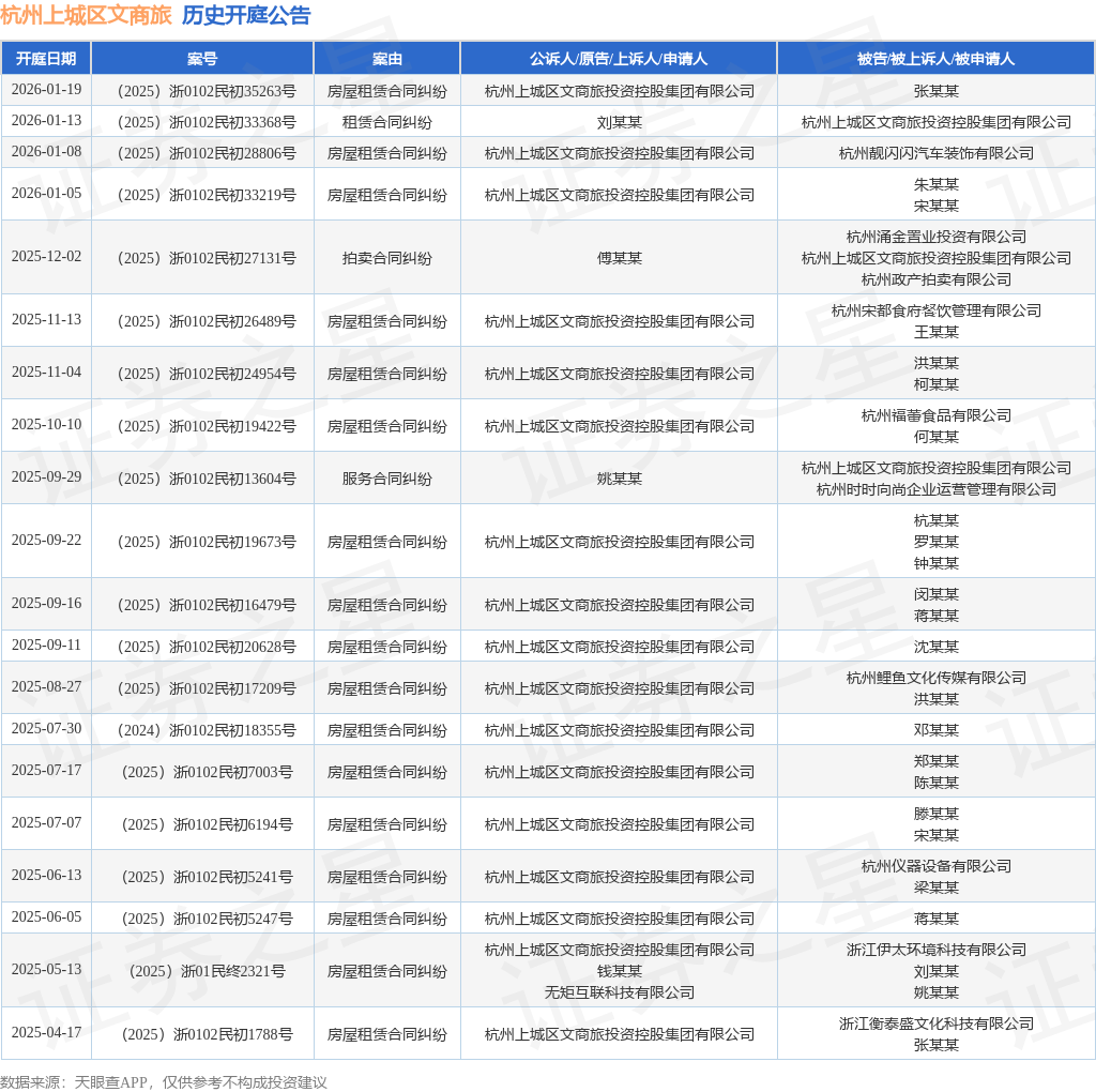 案号:(2025)浙0102民初35263号根据统计,近一年内以杭州上城区文商旅投资控股集团有限公司为当事人的历史开庭公告有27则,其中案由为“房屋租赁合同纠纷”的公告以24则居首,其次为“拍卖合同纠纷”有1则,“服务合同纠纷”有1则。历史开庭公告(前20条)如下: