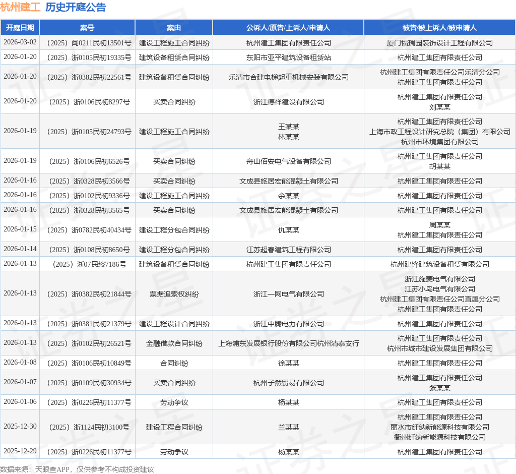 案号:(2025)浙0106民初6526号根据统计,近一年内以杭州建工集团有限责任公司为当事人的历史开庭公告有257则,其中案由为“买卖合同纠纷”的公告以77则居首,其次为“建设工程施工合同纠纷”有45则,“建设工程分包合同纠纷”有29则。历史开庭公告(前20条)如下: