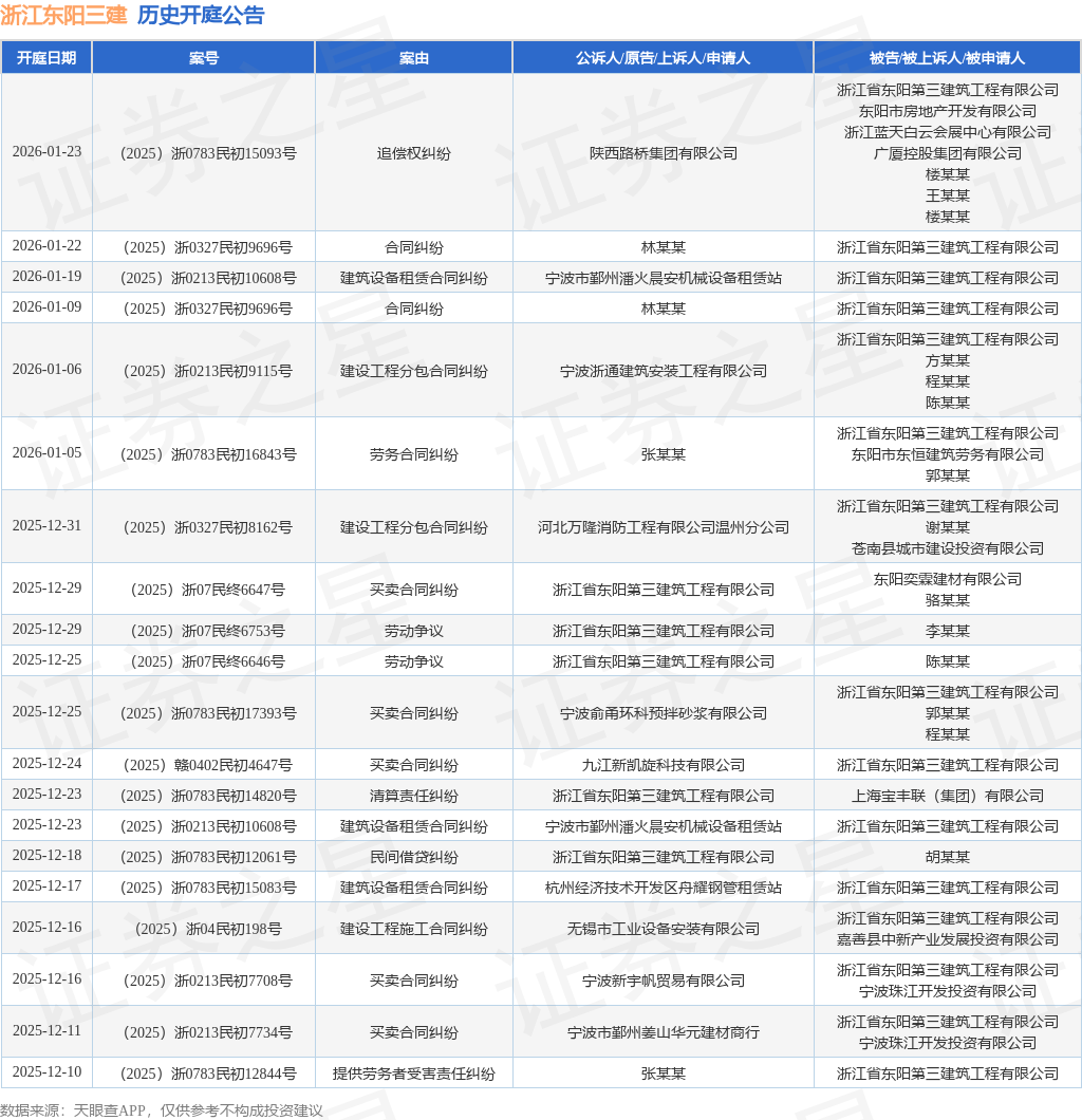 案号:(2025)浙0213民初10608号根据统计,近一年内以浙江省东阳第三建筑工程有限公司为当事人的历史开庭公告有144则,其中案由为“买卖合同纠纷”的公告以36则居首,其次为“劳务合同纠纷”有17则,“建设工程施工合同纠纷”有15则。历史开庭公告(前20条)如下: