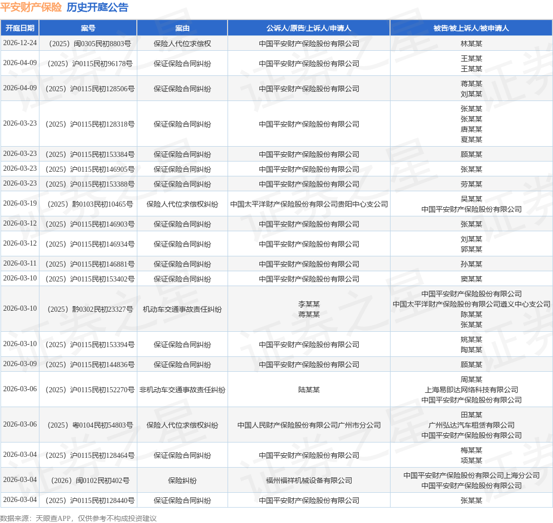 案号:(2025)闽0681民初6755号根据统计,近一年内以中国平安财产保险股份有限公司为当事人的历史开庭公告有1965则,其中案由为“机动车交通事故责任纠纷”的公告以958则居首,其次为“保证保险合同纠纷”有251则,“保险人代位求偿权纠纷”有164则。历史开庭公告(前20条)如下: