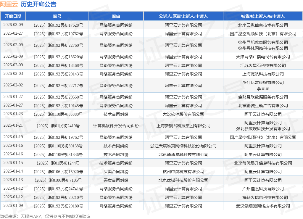 案号:(2025)浙0192民初19762号根据统计,近一年内以阿里云计算有限公司为当事人的历史开庭公告有265则,其中案由为“网络服务合同纠纷”的公告以130则居首,其次为“合同纠纷”有36则,“服务合同纠纷”有19则。历史开庭公告(前20条)如下:
