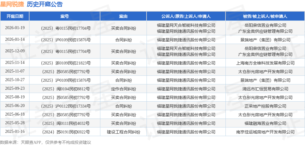 案号:(2025)粤0115民初17704号根据统计,近一年内以福建星网锐捷通讯股份有限公司为当事人的历史开庭公告有12则,其中案由为“买卖合同纠纷”的公告以7则居首,其次为“合同纠纷”有3则,“定作合同纠纷”有1则。历史开庭公告如下: