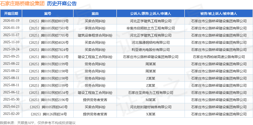 案号:(2025)冀0105民初8019号根据统计,近一年内以石家庄市公路桥梁建设集团有限公司为当事人的历史开庭公告有14则,其中案由为“买卖合同纠纷”的公告以4则居首,其次为“劳务合同纠纷”有4则,“建设工程施工合同纠纷”有2则。历史开庭公告如下: