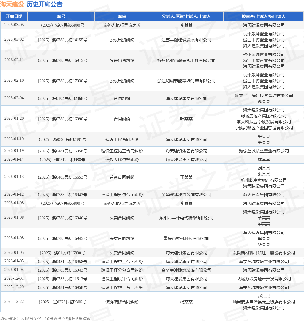 案号:(2025)浙0326民初2391号根据统计,近一年内以海天建设集团有限公司为当事人的历史开庭公告有188则,其中案由为“买卖合同纠纷”的公告以45则居首,其次为“建设工程施工合同纠纷”有29则,“建筑设备租赁合同纠纷”有19则。历史开庭公告(前20条)如下: