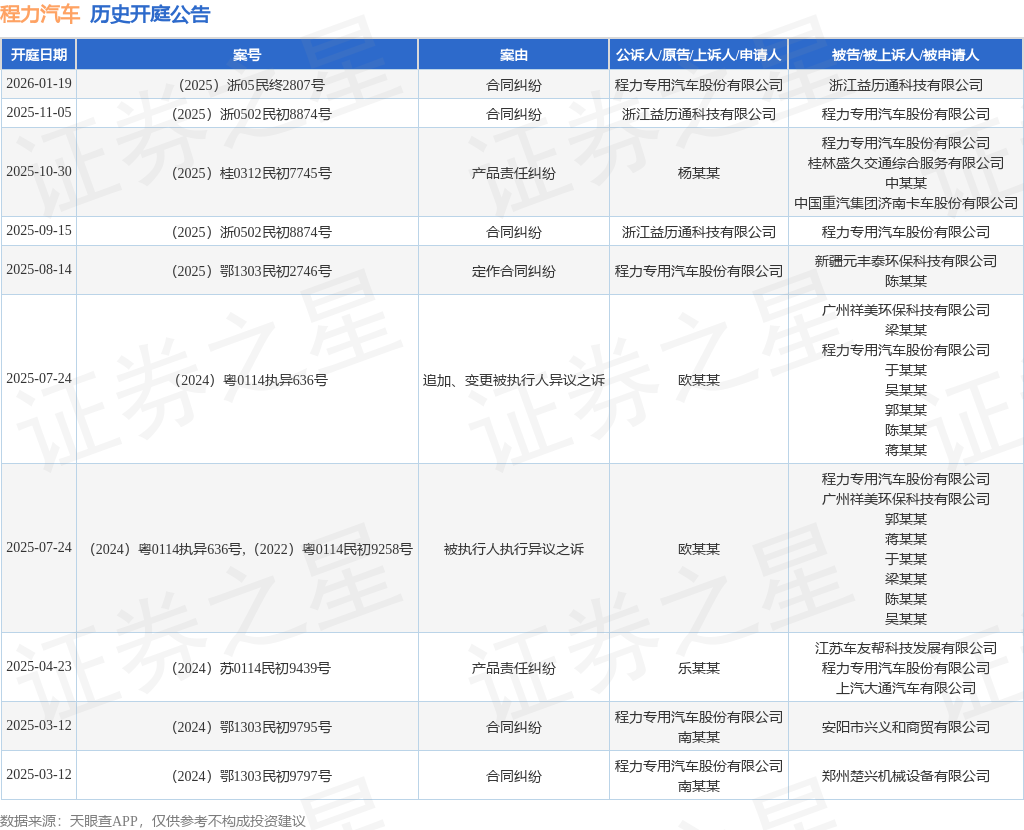 根据统计,近一年内以程力专用汽车股份有限公司为当事人的历史开庭公告有10则,其中案由为“合同纠纷”的公告以5则居首,其次为“产品责任纠纷”有2则,“定作合同纠纷”有1则。历史开庭公告如下: