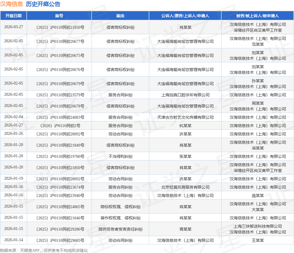 案号:(2025)沪0110民初28092号根据统计,近一年内以汉海信息技术(上海)有限公司为当事人的历史开庭公告有185则,其中案由为“劳动合同纠纷”的公告以52则居首,其次为“网络侵权责任纠纷”有26则,“服务合同纠纷”有23则。历史开庭公告(前20条)如下: