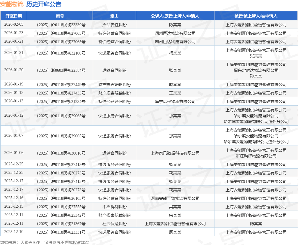 案号:(2025)沪0118民初27449号根据统计,近一年内以上海安能聚创供应链管理有限公司为当事人的历史开庭公告有134则,其中案由为“运输合同纠纷”的公告以34则居首,其次为“快递服务合同纠纷”有29则,“财产损害赔偿纠纷”有13则。历史开庭公告(前20条)如下: