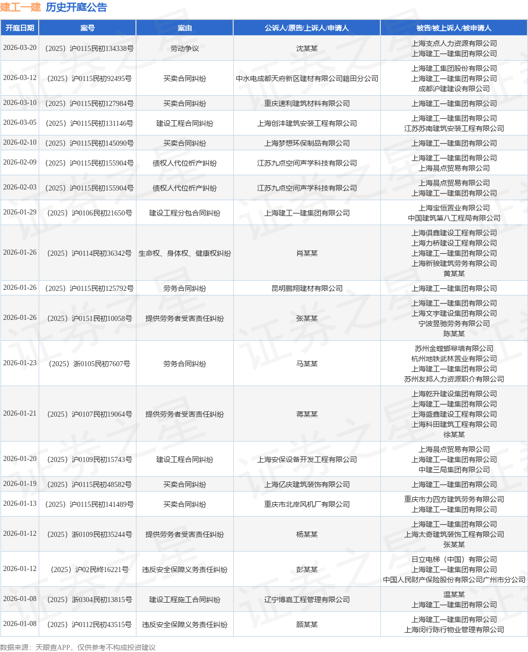 案号:(2025)沪0115民初48582号根据统计,近一年内以上海建工一建集团有限公司为当事人的历史开庭公告有284则,其中案由为“买卖合同纠纷”的公告以81则居首,其次为“建设工程施工合同纠纷”有36则,“建设工程分包合同纠纷”有30则。历史开庭公告(前20条)如下: