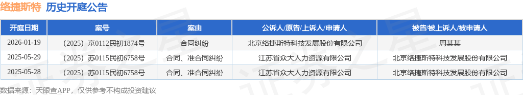 证券之星消息,根据天眼查APP显示,近日公布了一则北京络捷斯特科技发展股份有限公司作为原告/上诉人的开庭公告,详细内容如下: