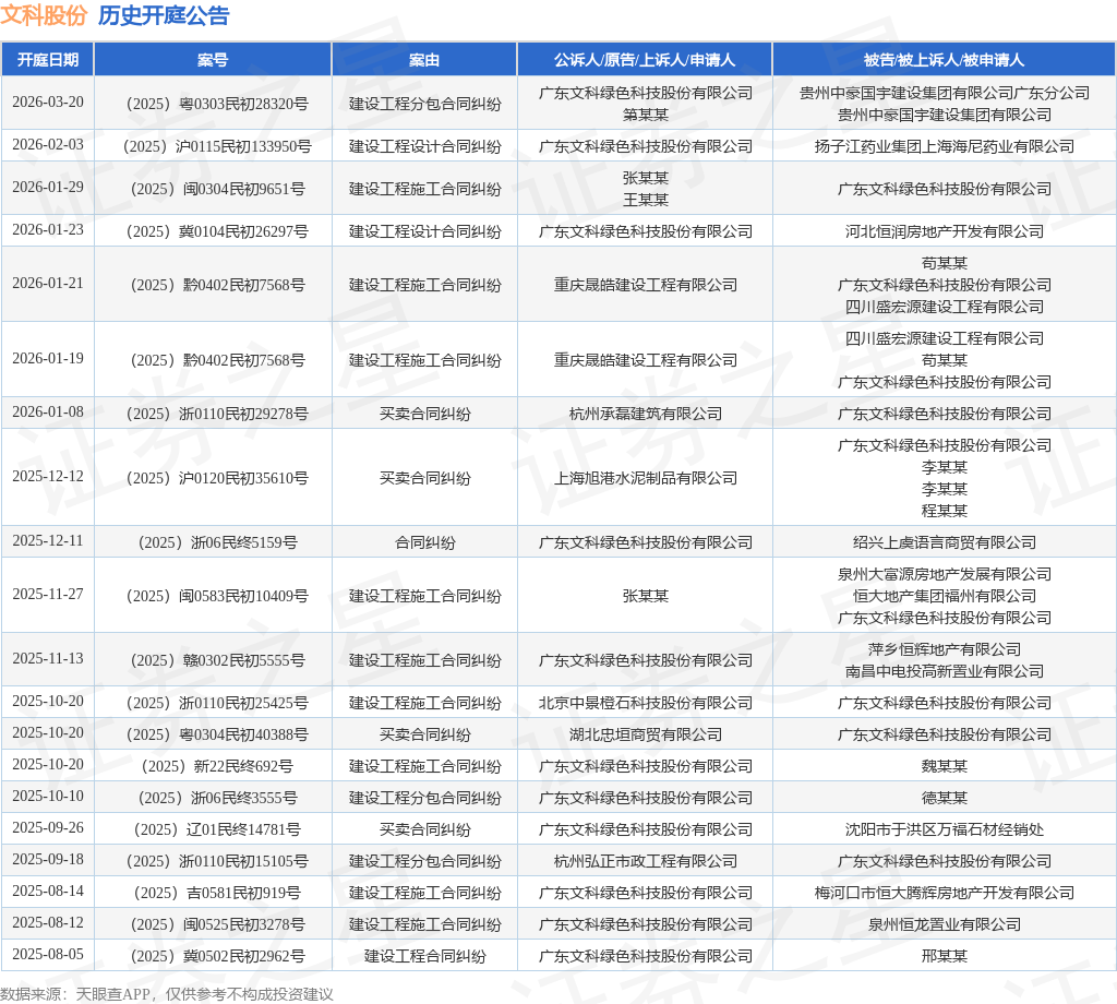 案号:(2025)黔0402民初7568号根据统计,近一年内以广东文科绿色科技股份有限公司为当事人的历史开庭公告有78则,其中案由为“建设工程施工合同纠纷”的公告以24则居首,其次为“买卖合同纠纷”有15则,“劳务合同纠纷”有13则。历史开庭公告(前20条)如下: