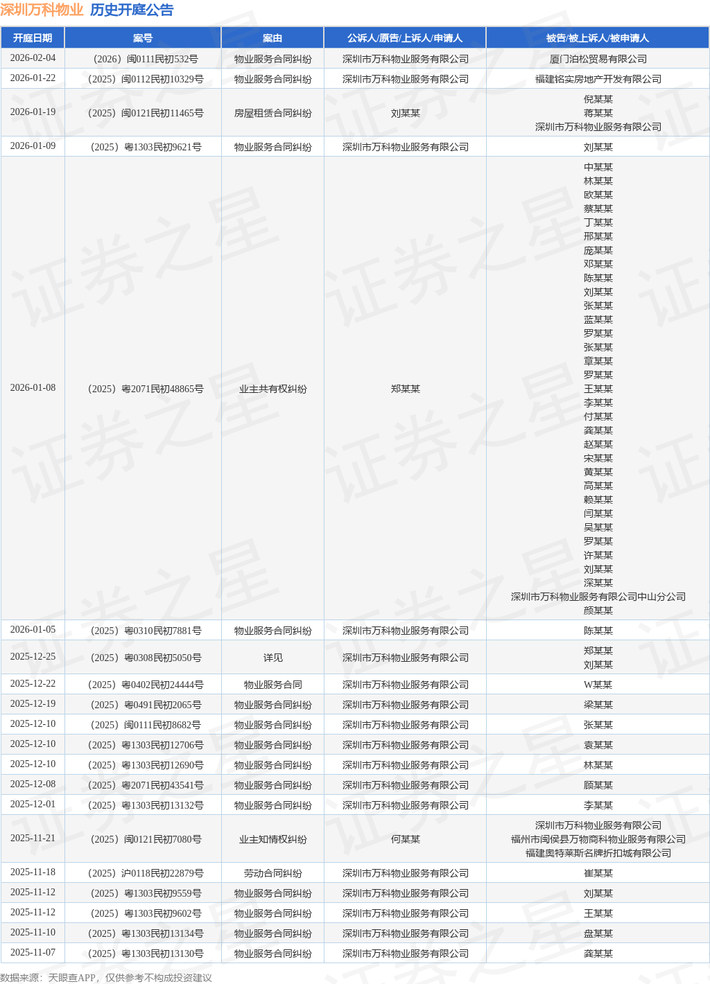 案号:(2025)闽0121民初11465号根据统计,近一年内以深圳市万科物业服务有限公司为当事人的历史开庭公告有127则,其中案由为“物业服务合同纠纷”的公告以112则居首,其次为“业主知情权纠纷”有2则,“服务合同纠纷”有2则。历史开庭公告(前20条)如下: