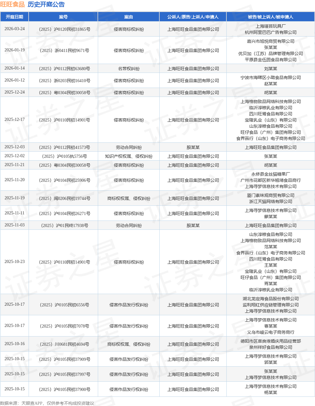 案号:(2025)浙0411民初9671号根据统计,近一年内以上海旺旺食品集团有限公司为当事人的历史开庭公告有121则,其中案由为“侵害商标权纠纷”的公告以64则居首,其次为“侵害作品发行权纠纷”有31则,“侵害作品信息网络传播权纠纷”有5则。历史开庭公告(前20条)如下: